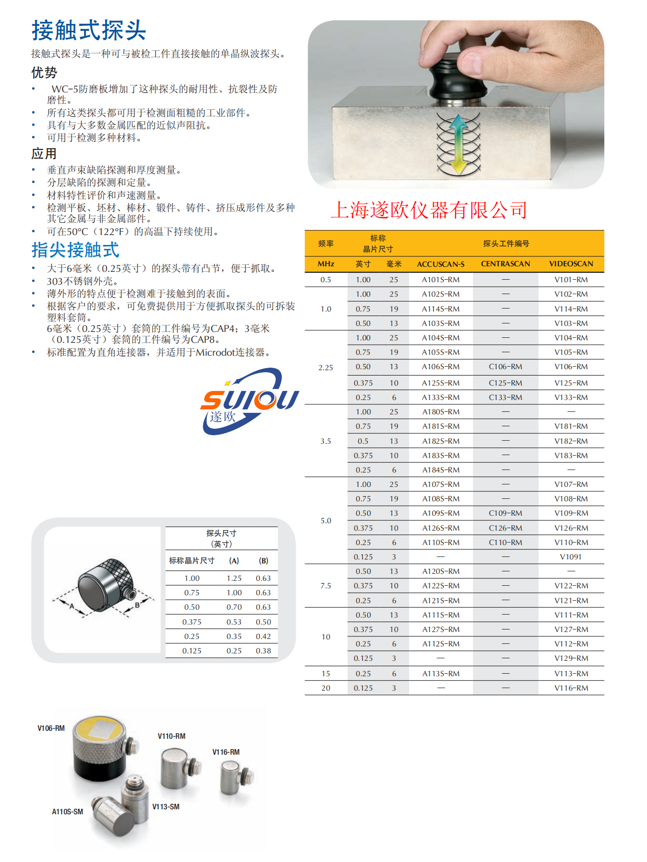 工件编号MHz 英寸 毫米 ACCUSCAN-S CENTRASCAN VIDEOSCAN 0.5 1.00 25 A101S-RM - V101-RM 1 1.00 25 A102S-RM - V102-RM 0.75 19 A114S-RM - V114-RM 0.50 13 A103S-RM - V103-RM 2.25 1.00 25 A104S-RM - V104-RM 0.75 19 A105S-RM - V105-RM 0.50 13 A106S-RM C106-RM V106-RM 0.375 10 A125S-RM C125-RM V125-RM 0.25 6 A133S-RM C133-RM V133-RM 3.5 1.00 25 A180S-RM - - 0.75 19 A181S-RM - V181-RM 0.5 13 A182S-RM - V182-RM 0.375 10 A183S-RM - V183-RM 0.25 6 A184S-RM - - 5 1.00 25 A107S-RM - V107-RM 0.75 19 A108S-RM - V108-RM 0.50 13 A109S-RM C109-RM V109-RM 0.375 10 A126S-RM C126-RM V126-RM 0.25 6 A110S-RM C110-RM V110-RM 0.125 3 - - V1091 7.5 0.50 13 A120S-RM - - 0.375 10 A122S-RM - V122-RM 0.25 6 A121S-RM - V121-RM 10 0.50 13 A111S-RM - V111-RM 0.375 10 A127S-RM - V127-RM 0.25 6 A112S-RM - V112-RM 0.125 3 - - V129-RM 15 0.25 6 A113S-RM - V113-RM 20 0.125 3 - - V116-RM