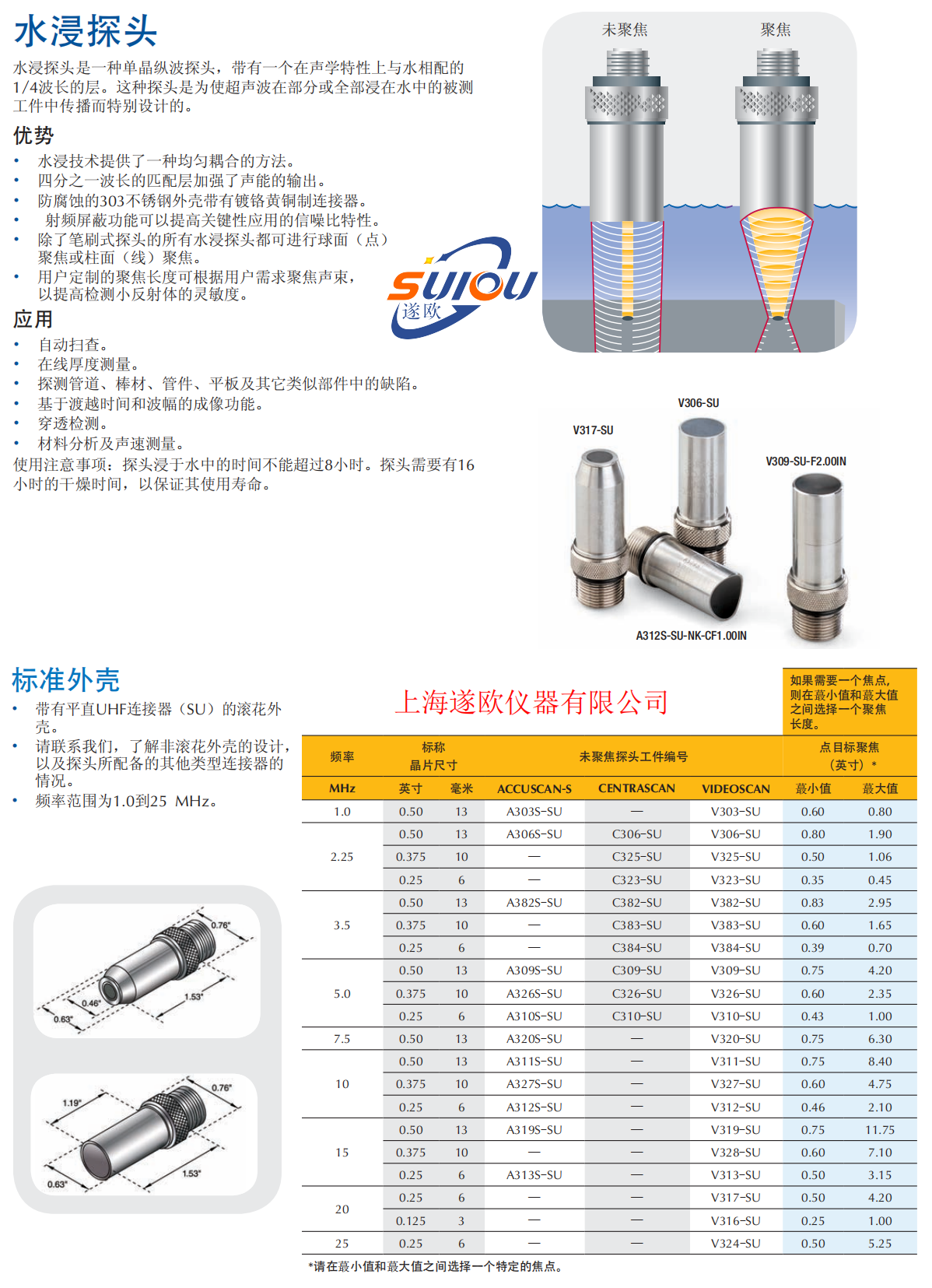 代理商:上海遂欧仪器有限公司V318-SU水浸探头是一种单晶纵波探头,带有一个在声学特性上与水相配的1/4波长的层。水浸探头是为使超声波在部分或全部浸在水中的被测工件中传播而特别设计的。 根据探头晶片尺寸、频率和是否聚焦而又众多细分型号,具体见详细介绍参数表。优势