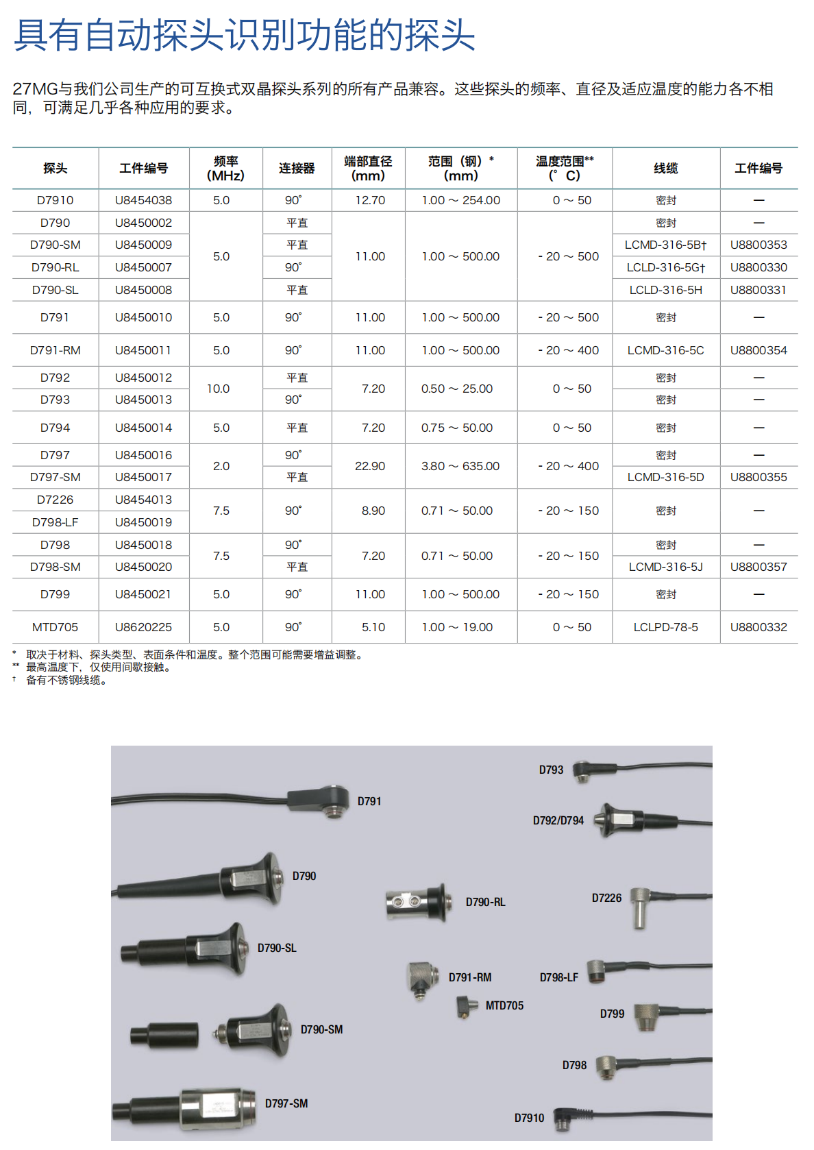 标准:0.01 mm.(0.001 in.)探头频率范围 2.25 MHz ~ 10 MHz(–3 dB)