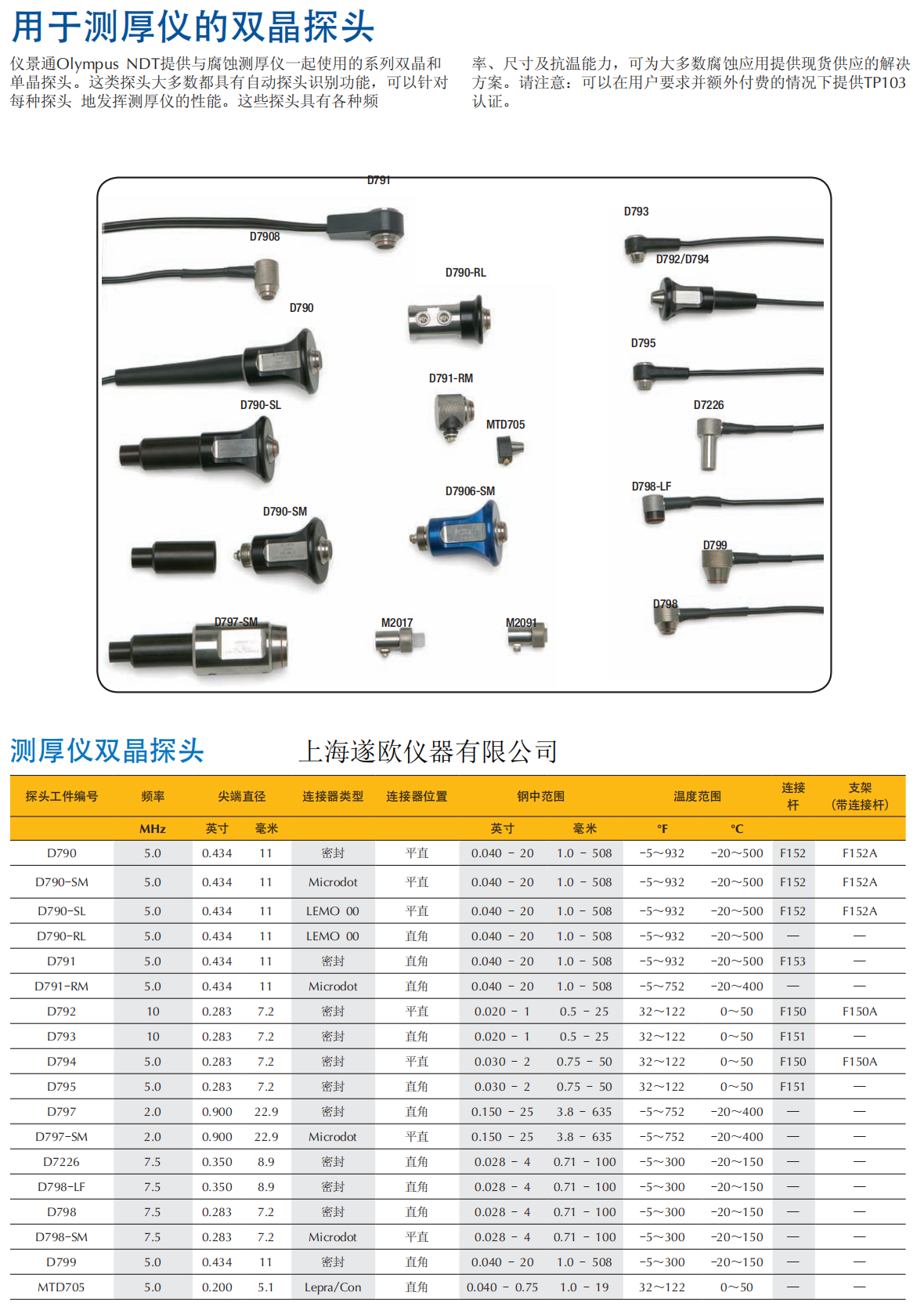 编号频率 端部直径 探头类型 连接器 钢中范围 温度范围 MHz 英寸 毫米 类型 位置 英寸 毫米 °C(摄氏度) V260-SM探头 U8411019 15 0.080 2 Sonopen Microdot 平直型 0.02 - 0.400 0.5 - 10 0 ~ 50 V260-RM探头 U8411018 15 0.080 2 Sonopen Microdot 直角型 0.02 - 0.400 0.5 - 10 0 ~ 50 V260-45探头 U8411017 15 0.080 2 Sonopen Microdot 45°角手柄 0.02 - 0.400 0.5 - 10 0 ~ 50 M2017探头* U8415002 20 0.250 6.35 内部氧化层 Microdot 直角型 钢:0.020 - 0.50