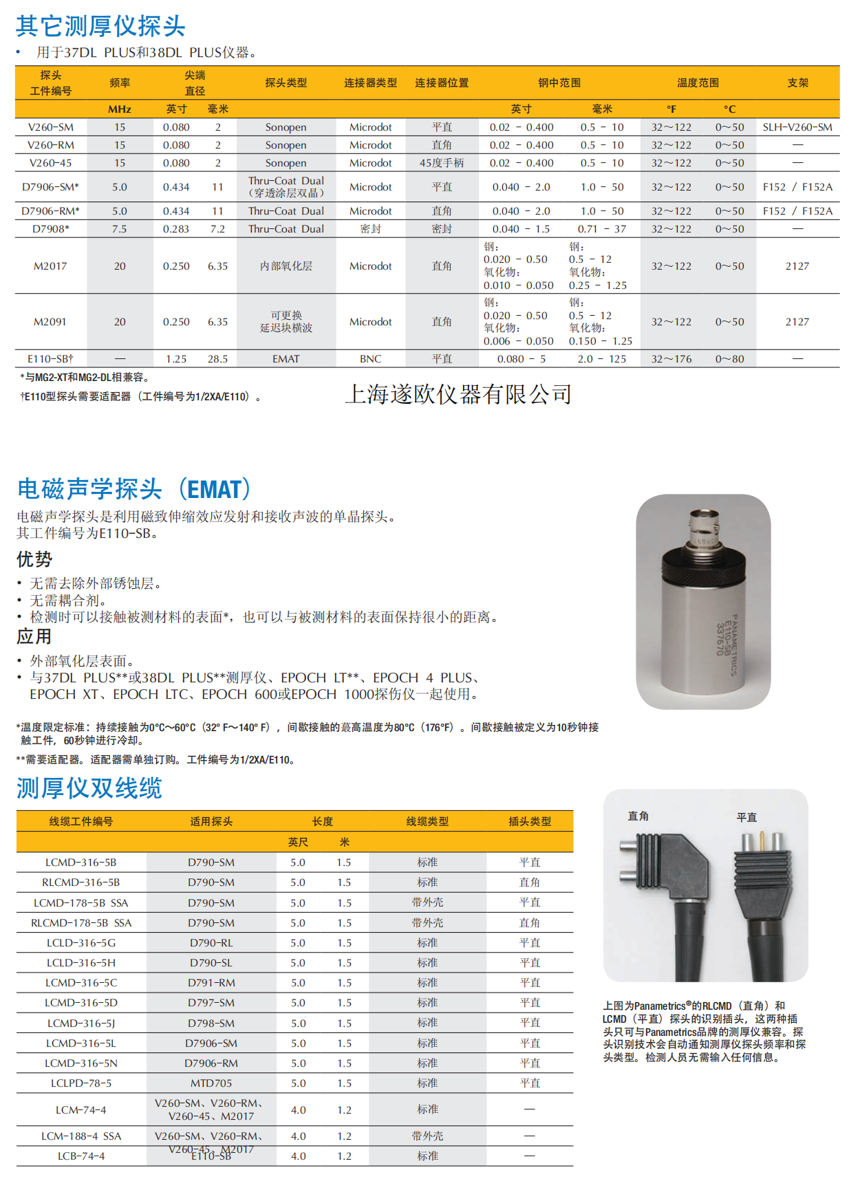 氧化物:0.150 - 1.250 ~ 50 E110-SB探头†** U8471001 - 1.25 28.5 EMAT BNC 平直型 0.080 - 5 2.0 - 125 0 ~ 80