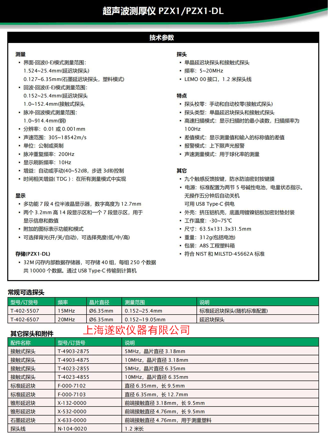 回波-回波模式测量范围: 延迟块探头0.152~25.4mm;接触式探头1.0~152.4m